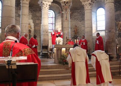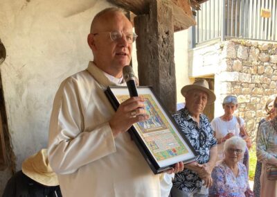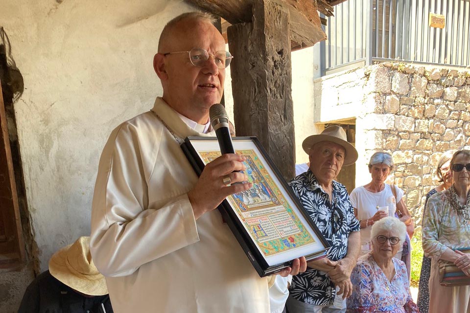 Le 21 juillet dernier, en la solennité de saint Victor et l’occasion du dixième anniversaire de la bénédiction abbatiale du Père Abbé Hugues, une centaine d’amis et de paroissiens, dont certains venus de Saint-Péray et Bourg-lès-Valence, étaient présents à l’Abbaye. Après la messe, nous nous sommes tous retrouvés au Petit Pré pour le désormais traditionnel méchoui. Le Père Abbé a reçu en cadeau une reproduction d’une enluminure d’un Missel victorin du XVIe siècle que vous pourrez voir désormais au réfectoire de l’Abbaye (et ci-contre) ainsi qu’un portrait du chanoine victorin Simon Gourdan (1646-1729).